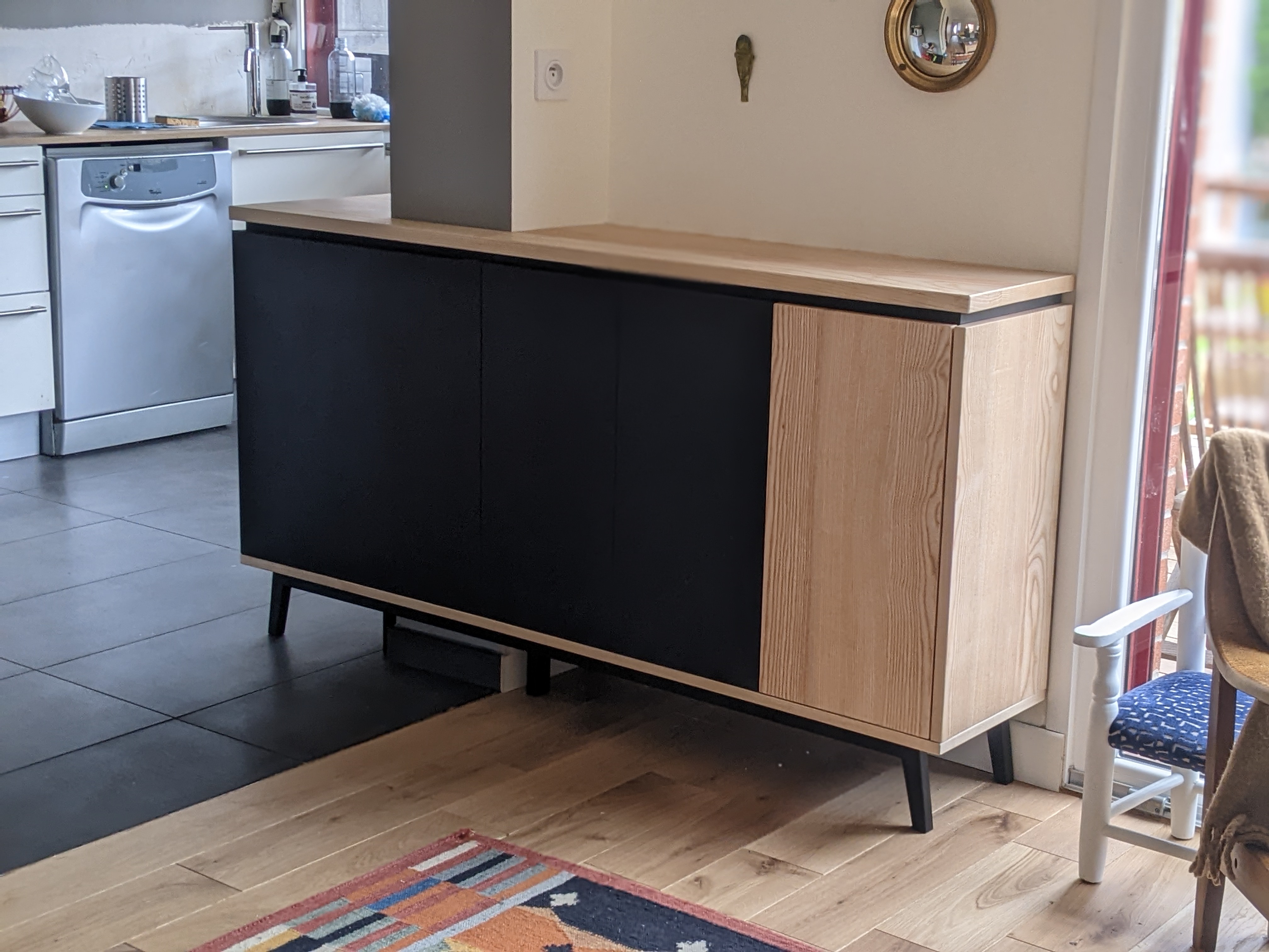 Le bois massif est constitué d’essences locales certifiées FSC et PEFC et d’un panel d’essences issu de seconde main ou de fruitiers de la région. Les produits dérivés et les produits de finitions sont sélectionnés avec soin : les médiums et agglomérés sont exclus (émanations de colle et de solvant), les produits à base aqueuse sont privilégiés.